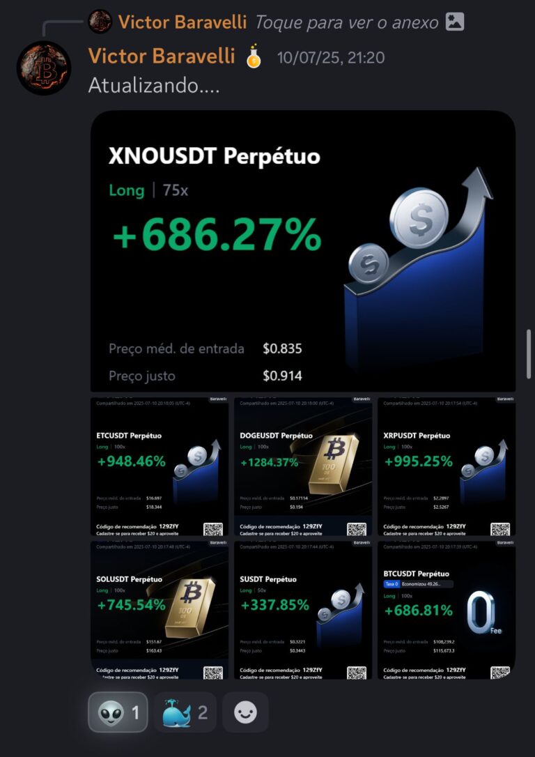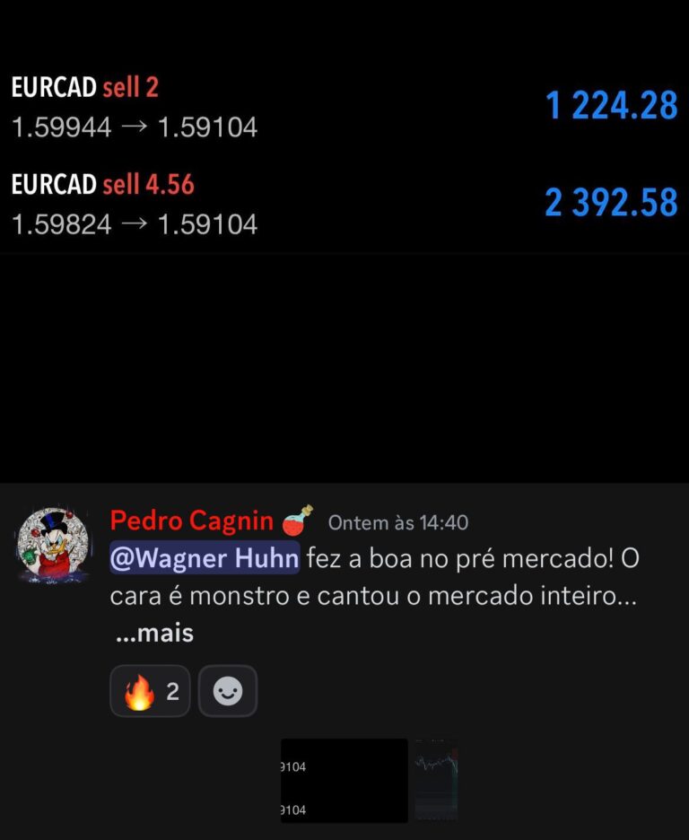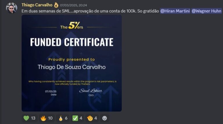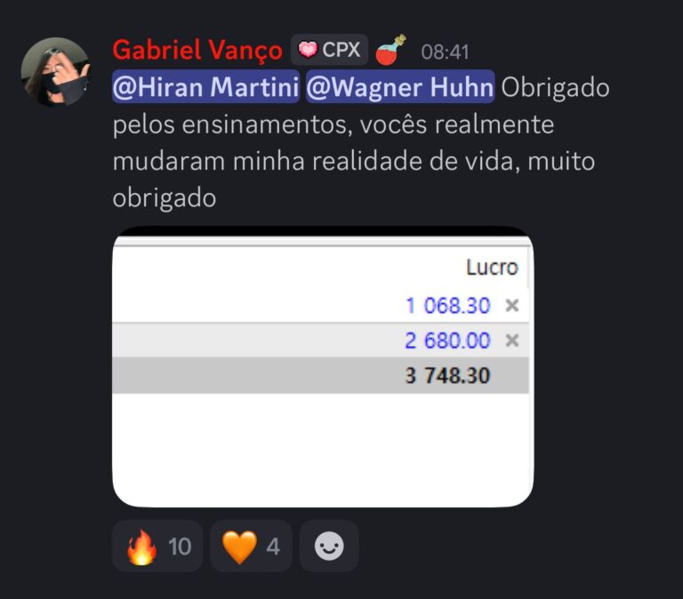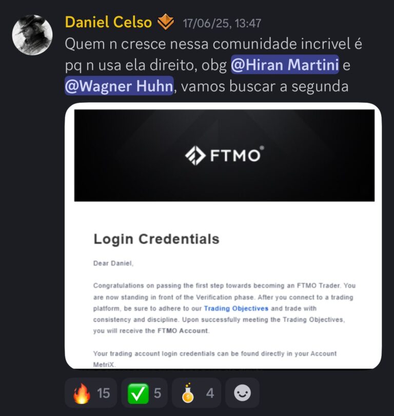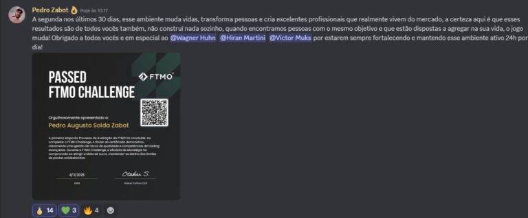 Tudo acontece dentro de uma comunidade ativa no Discord, onde rolam análises diárias, trocas de experiências, dúvidas respondidas, oportunidades frescas e muito networking. É como estar o tempo todo em uma sala com pessoas que têm o mesmo objetivo que você: crescer no mercado com consistência.